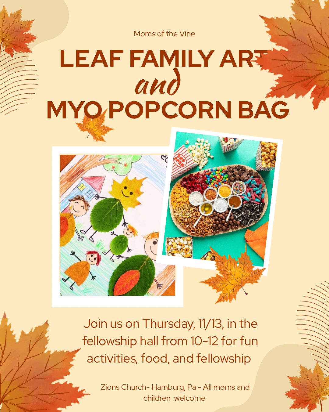 Moms of the Vine Make Your Own Popcorn Bag & Leaf People Art Moms & Kids are invited. + Add to Google Calendar + iCal / Outlook export Date Nov 13 2025 Expired! Time 10:00 am - 12:00 pm Location Zion's Church 770 Zion Church Rd, Hamburg, PA 19526 Category Zions Church/Fellowship Hall Share this event