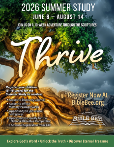 The 2026 Summer Study theme has been announced: Thrive, and the study passage is the Book of James. Over 8 weeks (June through August), kids work through a guided Discovery Journal that teaches them how to study the Bible using tools like keywords, cross-references, and word studies – all built around James. It only takes about 30 minutes a day, and kids can participate on their own or join a local group.