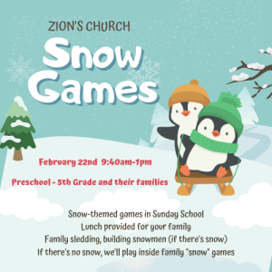 Snow Games Feb. 22nd – 9:40am – 1:00pm Winter family fun in the snow. If there’s no snow on the ground, we’ll make our own! RSVP at zionschurch.org/hub ...